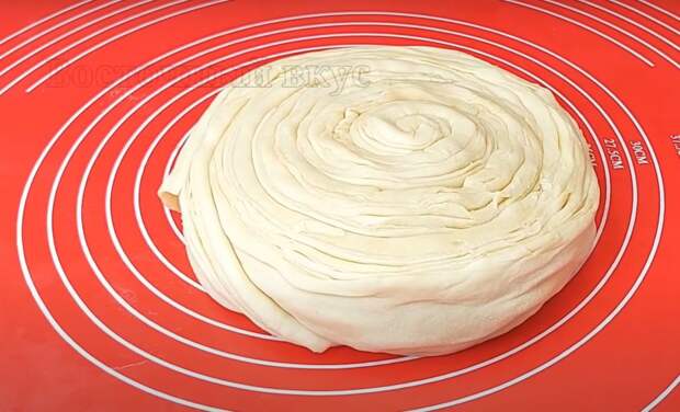 Даем рулету настояться в течение 10 минут. Затем раскатываем улитку до диаметра 30-35 см, толщиной 5-7 мм. С оставшимися двумя колобками поступаем аналогично.