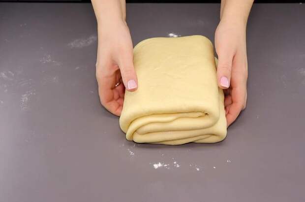 Эту форму надо просто смазать маслом, покрыть ком полотенцем и убрать в тепло, не вынимать 50 минут.Далее раскатываем ком в пласт шириной 4 мм, он должен быть диаметром 65 см примерно. Снизу делаем загиб к центральной части, загибаем верх и кладем внахлест на первый слой. С двух сторон делаем загибы к центру и складываем пополам. Накрываем тесто глубокой тарой на 15 минут.